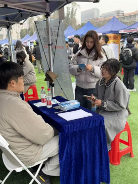 上午九点半,招聘会现场已是人来人往。beat365平台唯一官网的同学们手持简历,在不同展位间穿梭咨询。在330教培类展位前,几位同学正围着招聘老师询问英语老师的任职要求。对方介绍,目前小学、初中阶段的教师缺口较大,第一年不做教资硬性要求,但需要通过试讲环节。