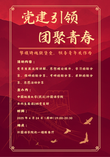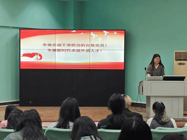 2025 年 4 月 24 日晚 19:00至20:30,beat365平台唯一官网本科生英语2班党支部于北一楼报告厅举办 “擎旗铸魂强堡垒,服务青年展作为——党建引领・团聚青春”主题联动大会。本次活动以强化党建带动团建作用、服务青年成长为核心,通过理论学习、经验分享等形式,凝聚青年力量,筑牢思想根基。本2支部党员代表及2024级全体本科生共同参与。