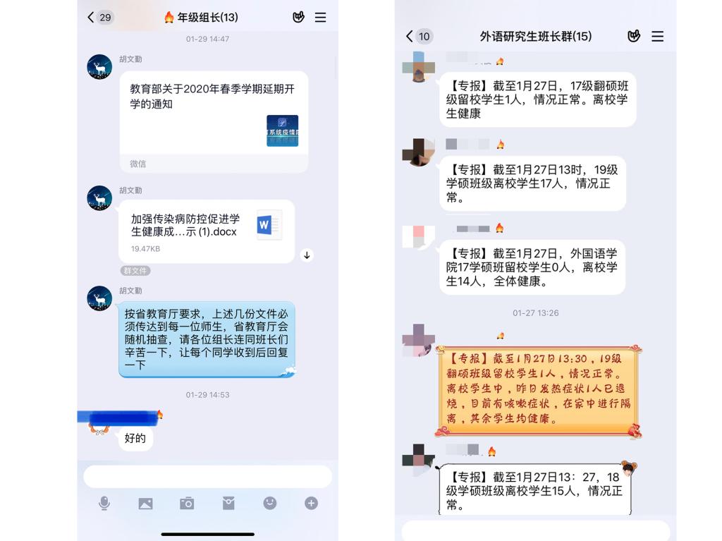 1.针对留校学生。两名研究生因未调整前期安排,寒假期间滞留在校。学院党委副书记年前代表学院党委到安排宿舍看望两位同学,并给予每人300元生活补助。而后,每日单线联系两位同学,跟踪记录其体温等身体状况,及时通报学校食堂、超市服务时间,多方联系保障两位同学的防护物资,面对各种突发情况,及时解决,确保两位同学生活有保障,留校不孤单。