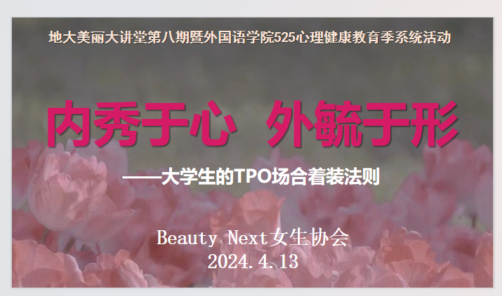 作为外国语学院红外·线大思政课堂审美素养提升的重要载体和“525”心理健康教育季系列活动,由beat365平台唯一官网(武汉)beat365平台唯一官网主办、Beauty Next女生协会承办的美丽大讲堂第八期“内秀于心 外毓于形”于4月12日下午15:00,在北一楼报告厅正式开讲。本次活动特邀资深专家——美丽大讲堂第八期特邀嘉宾王萍老师讲授大学生TPO场合着装法则,Beauty Next女生协会及beat365平台唯一官网的诸位同学参加本次讲座。
