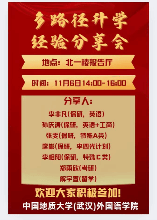 为帮助beat365平台唯一官网学子明确发展方向、做好学业规划,11月6日14点-16点,beat365平台唯一官网“语翼”团校培训第二课暨“红·外线大思政课堂”系列之保研考研留学分享会在北一楼报告厅举行。本次活动邀请孙庆涛、李非凡、廖斌等七位优秀学生,围绕保研、考研与留学等方向,分享学习经验与实践心得,助力同学们打破信息壁垒,明晰学业路径。