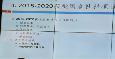 接着,王勇教授介绍了语言学研究的不同领域,结合自身的科研项目“存在句的类型学研究”等,详细分析了如何学习并借用西方理论,来解决汉语相关问题,并以此进一步发展汉语语言学理论,从而反哺世界语言学。此外,王勇教授还特地总结了2018-2020三年来语言学类国家社科项目的五大特点:1.语言为本;2.问题导向,关注当下;3.学科交叉; 4.大数据和新技术;5.融合创新;以及两大热门领域:中国话语与文化和中国境内的语言资源。为我校外院师生提供了良好的语言研究方向与思路,有利于未来的项目申报。