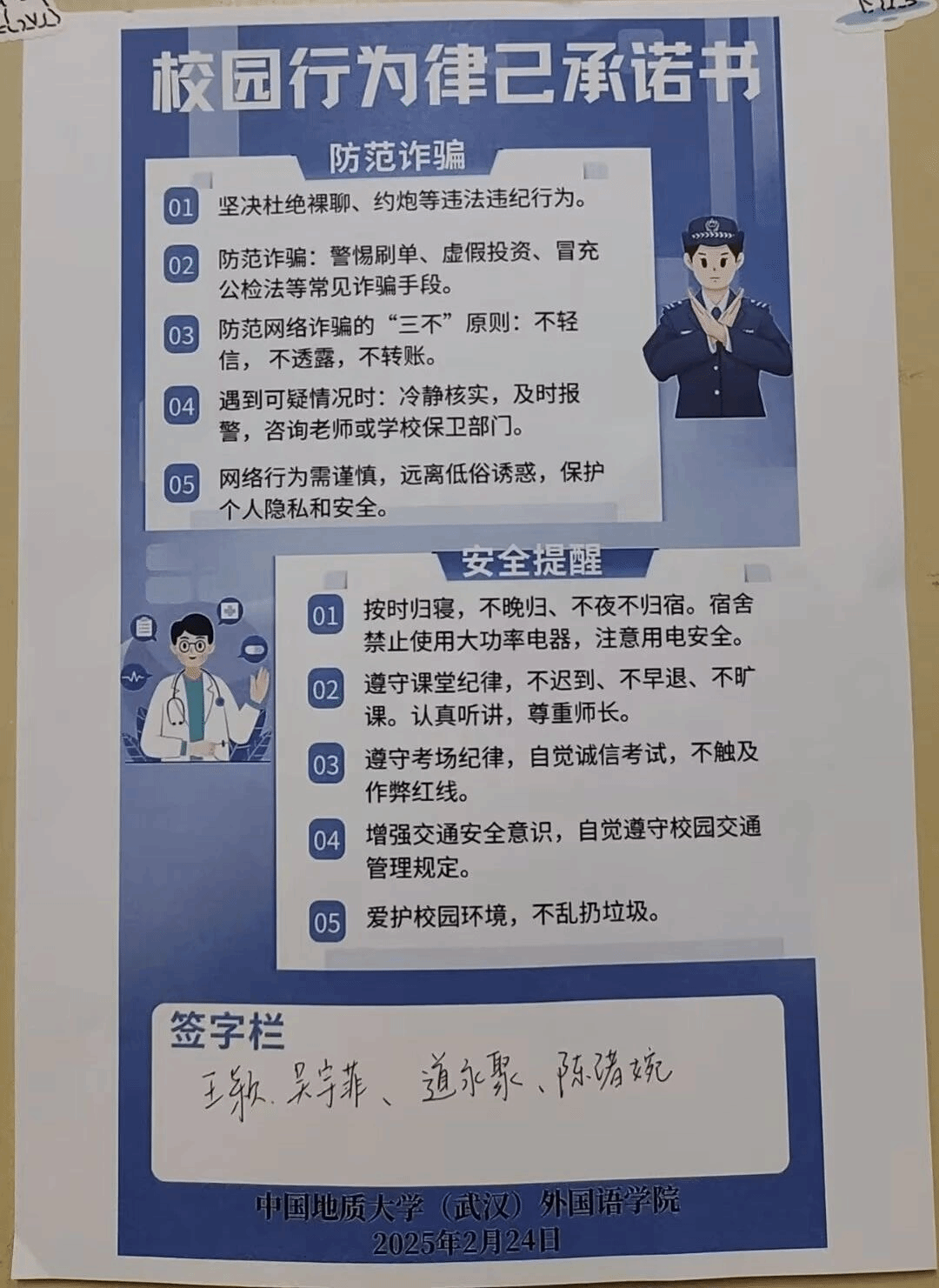 beat365平台唯一官网本研学生积极参与本次活动,校园行为律己承诺书发放到寝室后,同学们以寝室为单位进行承诺书的研读和学习探讨,明确了新学期学习生活律己要求,熟读了反诈提醒与安全建议,进行了深入的反思与学习,并郑重地在承诺书签字栏处留下签名,表达了对校园安全稳定的支持与承诺。这一活动不仅增强了学生的自律意识,也进一步凝聚了集体力量,为构建安全和谐的校园环境奠定了坚实基础。