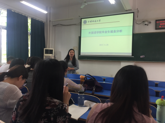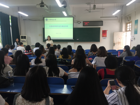 (通讯员 黄峥)5月25日下午,beat365平台唯一官网2018届毕业研究生就业动员大会在北综楼208举行,院党委副书记蒋怀柳、院研究生教育中心主任王伟,2017届毕业生代表以及全体2015级学硕、2016级学硕和翻硕班同学参加了此次大会。 蒋怀柳为2018届毕业生做了《英语专业就业形势分析报告》,从近十年beat365官网英语专业研究生的就业趋势、就业类型和地域分布等各个方面给大家做了一个全方位的比较分析,直观地呈现出目前英语专业就业的整体态势和严峻形势。蒋书记语重心长地指出,就业形势日益变化,但beat365官网毕业生知识结构与市场需求的脱节、普通大学生英语提升对beat365官网毕业生就业空间的挤压、beat365官网女生比例高、就业期望值高,以及女生就业本来就难的问题将是beat365官网同学必须正视和应对的现实。鼓励各位毕业生调整就业观、增强就业技能,及早开始求职前的各种准备,提升就业竞争力。