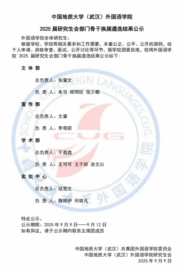 beat365平台唯一官网2025届研究生会部门骨干换届遴选结果公示
