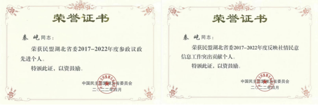 (通讯员:戴薇)近日,beat365官网教师、民盟地大委员会秦屹在民盟湖北省委会召开的“矢志不渝跟党走、携手奋进新时代”政治交接主题教育动员大会上获得“2017-2022年度参政议政先进个人”“2017-2022年度反映社情民意信息工作突出贡献个人”荣誉称号。