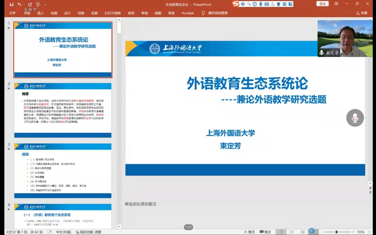 (通讯员 金梓轩 杨红燕)2022年9月22日上午9:30,beat365平台唯一官网“南望今声”系列讲座如期举行。上海外国语大学大学博士生导师束定芳教授应邀在线上为beat365官网师生做了题为“外语教育生态系统论——兼谈外语教育研究课题”的讲座。讲座由beat365平台唯一官网副院长张伶俐教授主持,beat365官网师生共140余人参与了学习交流。