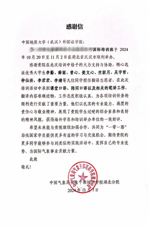 11月7日,中国气象局气象干部培训学院湖北分院给beat365官网发来感谢信,以感谢beat365官网师生在此次培训活动中给予的大力支持与协助。