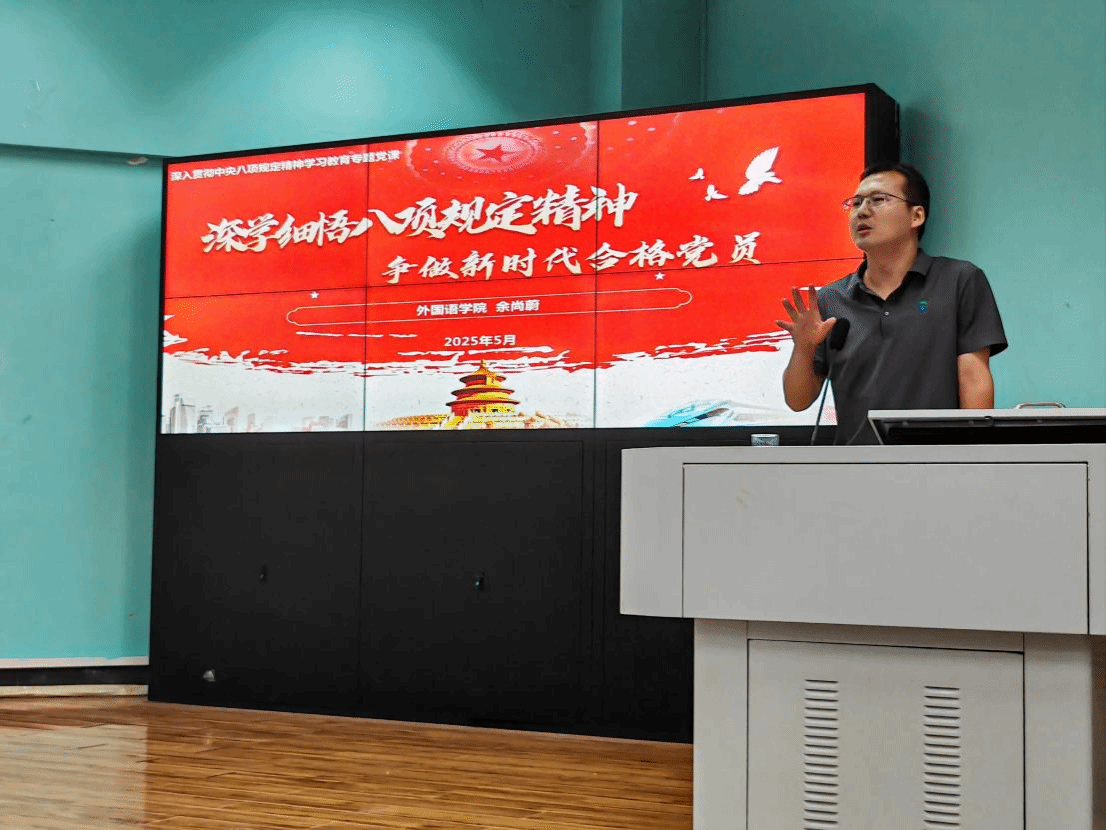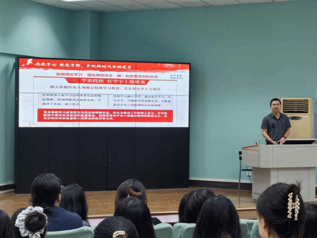(通讯员 黎颖)为扎实推进深入贯彻中央八项规定精神学习教育,以“学”筑基来校准思想坐标,2025年5月26 日,beat365平台唯一官网党委副书记余尚蔚以“深学细悟八项规定精神,争做新时代合格党员”为题给全体学生党员讲授专题党课。