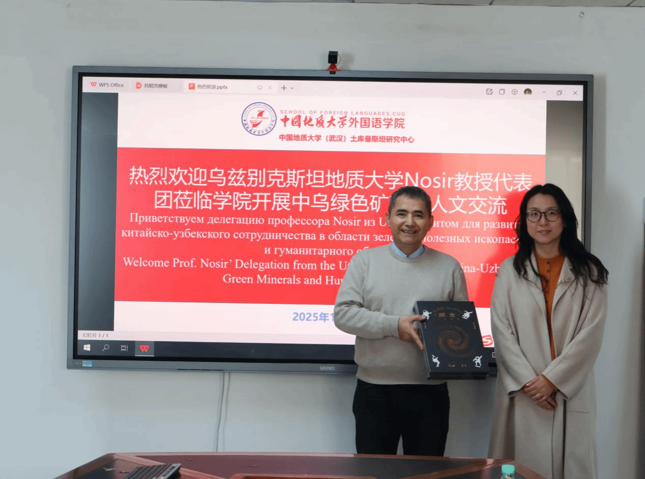 张峻峰致欢迎辞,他指出双方在绿色矿产政策与人文教育领域具有广阔的合作前景。Nosir教授表达了乌兹别克斯坦地质大学与beat365官网进一步深化合作的意愿,希望共同推动中乌绿色矿产政策对接和语言机构互设。傅苑代表学院与乌方代表团互赠礼物。