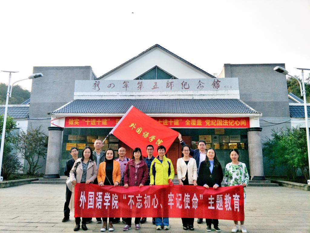 2019年11月9日上午8点,外国语学院领导班子及教工党支部支委一行12人乘车奔赴湖北大悟。上午首先到芳畈白果树湾参观全国百家经典红色实践基地之一的李先念新四军五师纪念馆、司令部旧址,瞻仰宋斌烈士墓。以李先念同志任师长兼政治委员的新四军第五师在此驻扎五年之久,依托大悟山天然屏障,部队由160人发展到5万余人,开辟了以白果树湾为中心,纵横千里的鄂豫皖湘赣五省的抗日根据地,大小战斗达1300余次,威震中原!