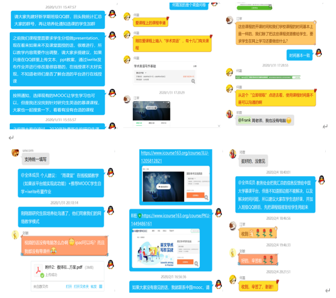 自1月30号开始,在校研究生院的具体要求和指导下,学院张基得书记、张峻峰院长高度重视,积极部署。承担我校研究生公共英语教学的老师们充分利用原定返校开学日期前的时间,在QQ群里开展头脑风暴,充分讨论如何因地制宜地开展学习、教学和研究工作,迅速制定研究生科技英语写作与交流“一课一策”教学工作组织方案。