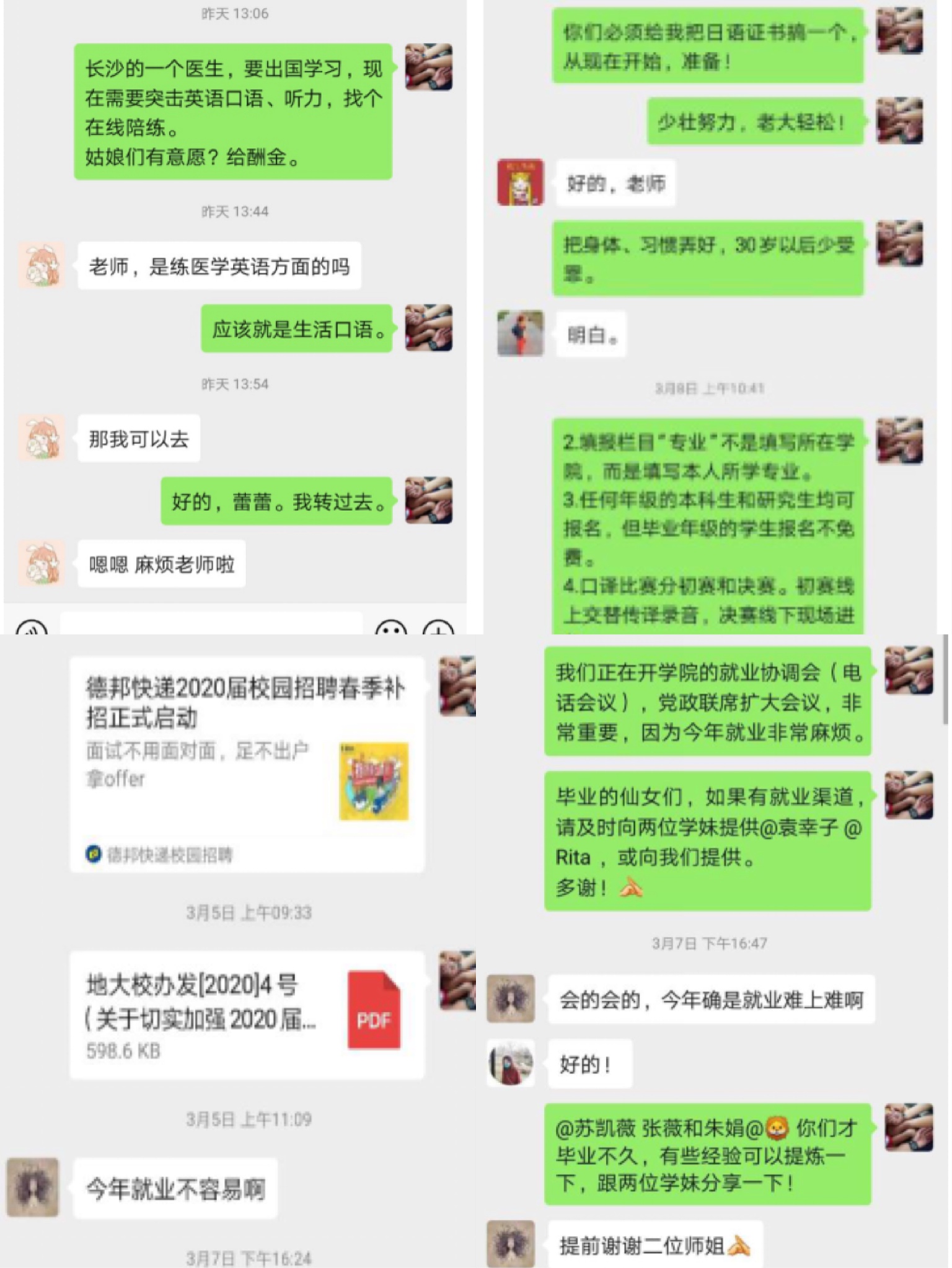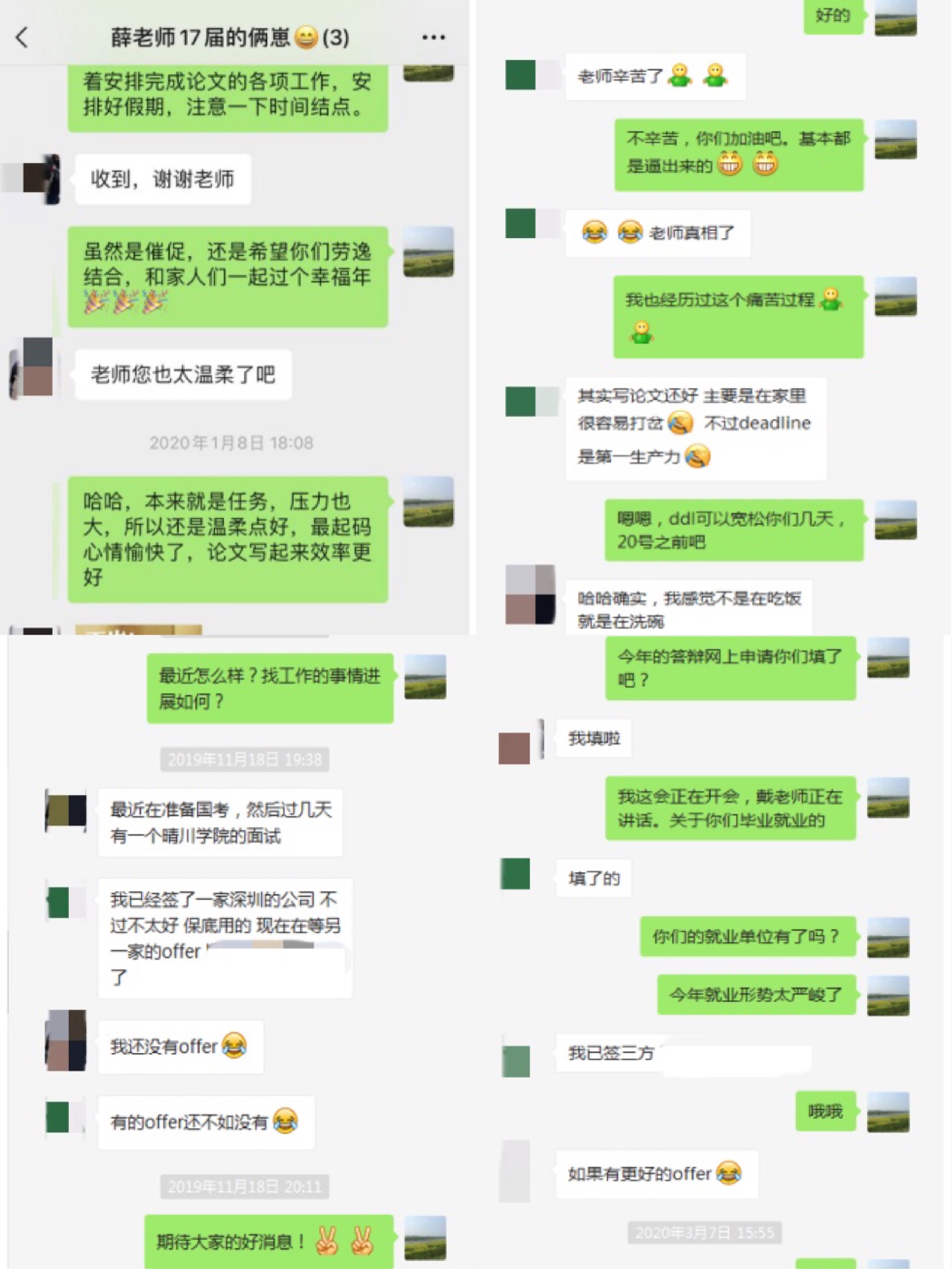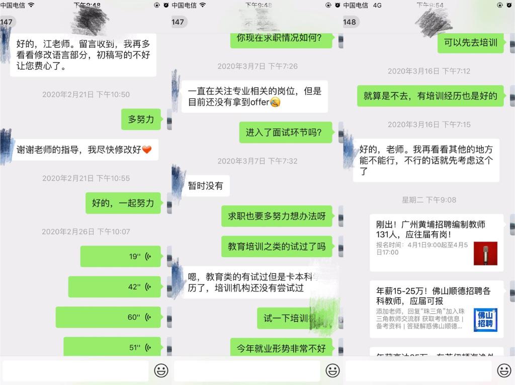 除学校和学院组织的网络双选会、空中宣讲会以及在线面试之外,导师们也都通过多种途径主动跟进毕业生就业意向、就业动态,不遗余力地寻找各类就业信息与途径,在自己有限的能力范围内尽最大可能帮助学生解决就业难题。王伟老师和汪卫红老师常在研究生群里发布专业相关招聘和培训信息。李孝奎老师通过电话与自己的研究生进行沟通,与研究生召开定期例会,就文献阅读,科研探索和实习实训等话题进行交流和指导。李老师今年的毕业研究生方同学面临着初步入职协议保底、签订意向协议、备战公务员考试等几种选择,目前疫情造成不少工作停滞,李老师在学生迷茫时常给予鼓励和建议。