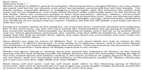 During the special period of the outbreak of COVID-19, online teaching was carried out in such a special way. The present “war without smoke of gunpowder” brought teachers and students too much meditation and insights in numerous aspects, for example, in life, awe, responsibility, and gratitude. College English is one of the public courses with the longest teaching hours and the largest number of students in CUG, so how can teachers efficiently complete College English courses on time according to the teaching plan, and how can they, meanwhile, pay attention to the psychological state of students, direct them in thoughts, touch them in soul, and share patriotic feelings and the strength of China with them? This was the problem considered most by teachers from the “ideological and political course” team of the School of Foreign Languages before College English classes started.